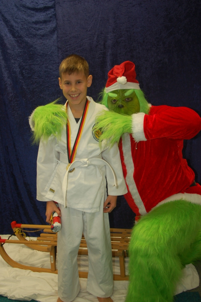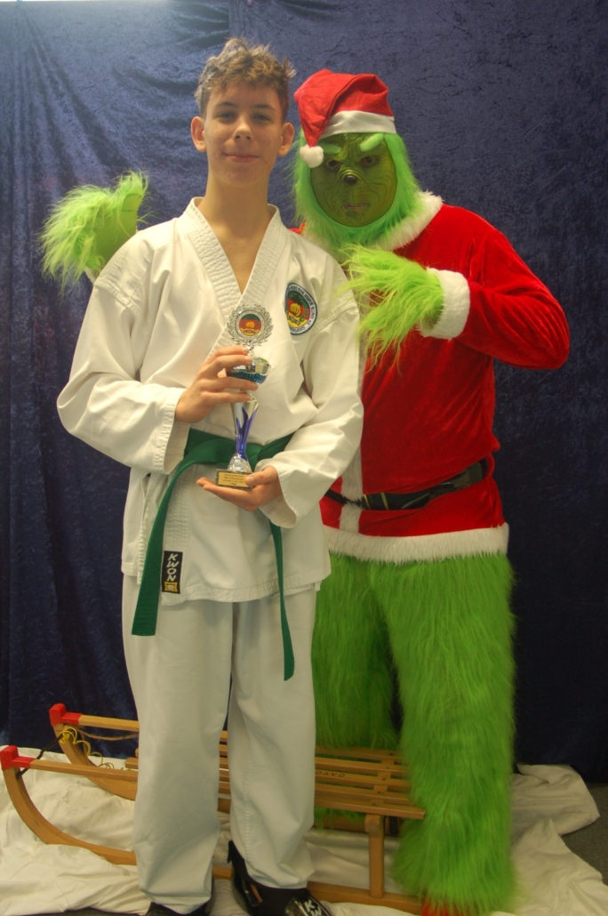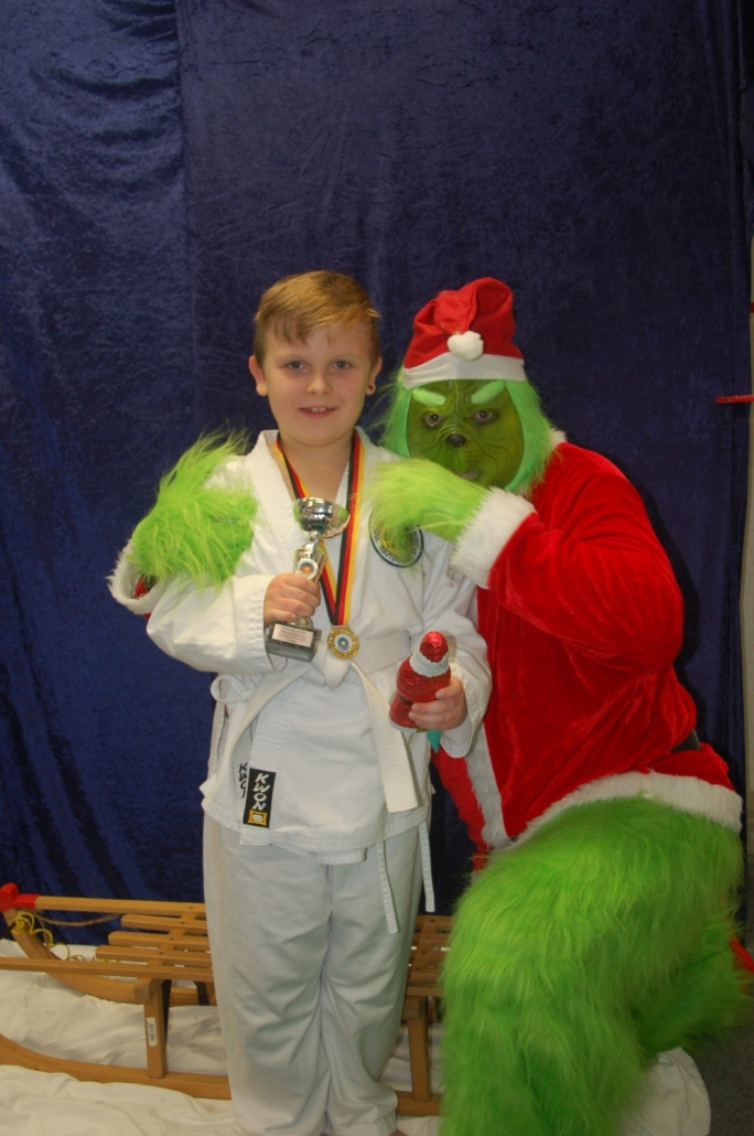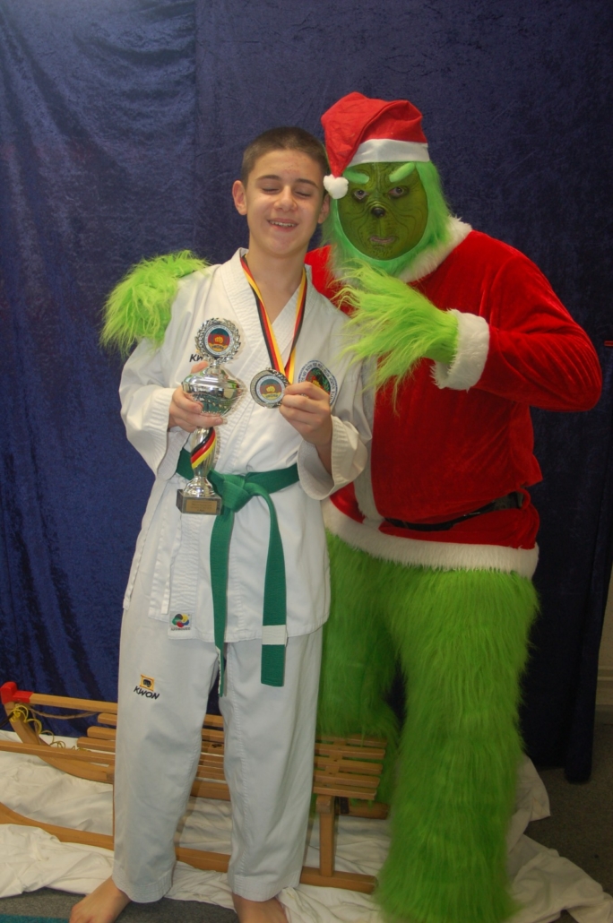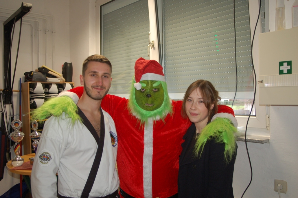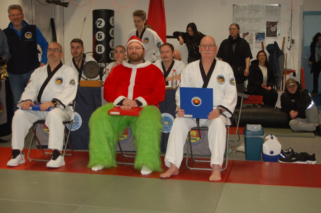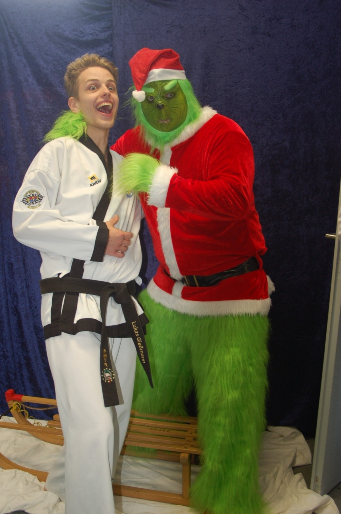 Wer hätte gedacht, dass ausgerechnet der Grinch den Weg ins Kodang Gym Letmathe findet? Zwischen den Wettkämpfen schlich er sich plötzlich in die Halle – und sorgte für jede Menge Gelächter. Statt Geschenke zu klauen, versuchte er diesmal, den Technikerpokal an sich zu reißen. Zum Glück war Nevio Palermo schneller und verteidigte seine Trophäe mit sportlichem Einsatz.