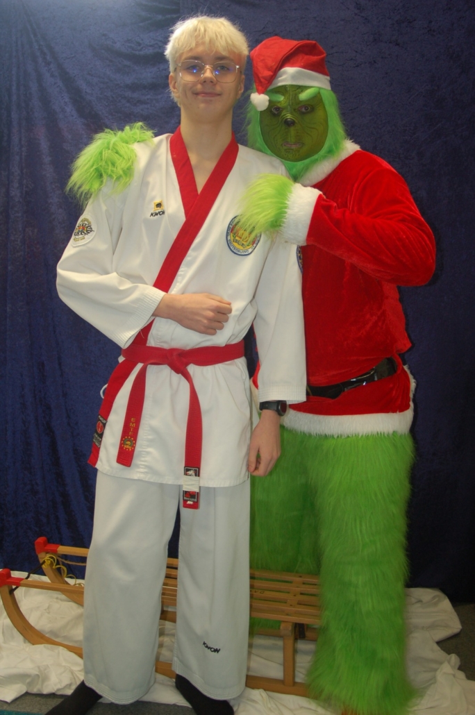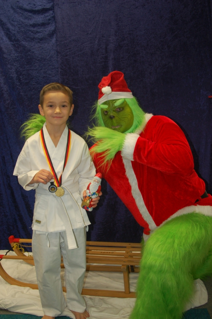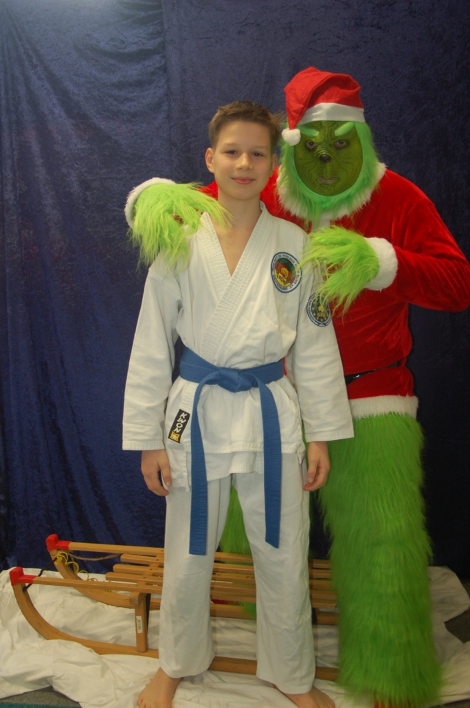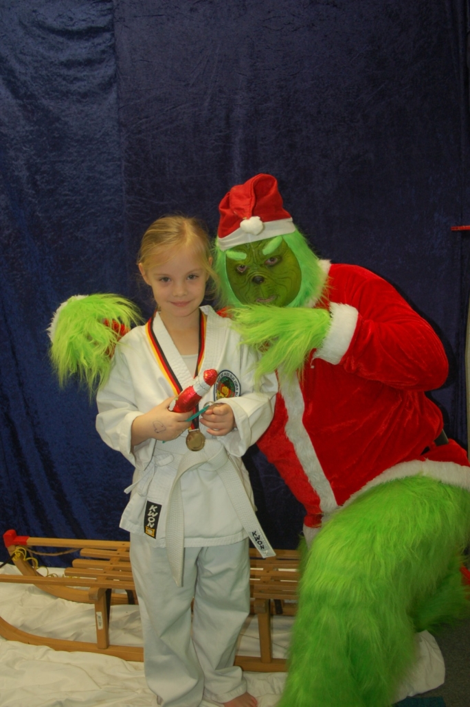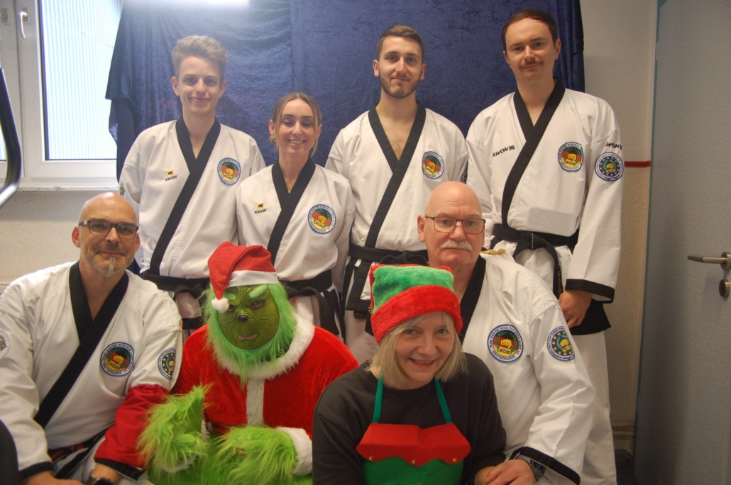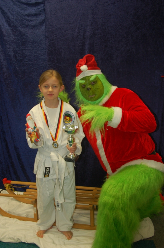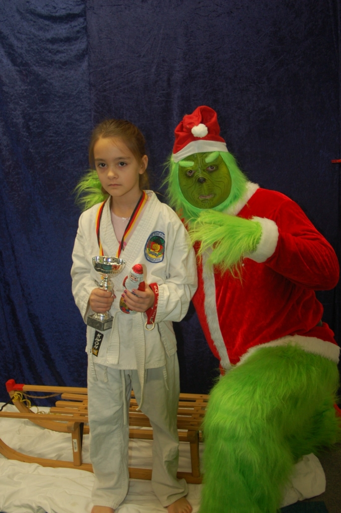 Wer hätte gedacht, dass ausgerechnet der Grinch den Weg ins Kodang Gym Letmathe findet? Zwischen den Wettkämpfen schlich er sich plötzlich in die Halle – und sorgte für jede Menge Gelächter. Statt Geschenke zu klauen, versuchte er diesmal, den Technikerpokal an sich zu reißen. Zum Glück war Nevio Palermo schneller und verteidigte seine Trophäe mit sportlichem Einsatz.