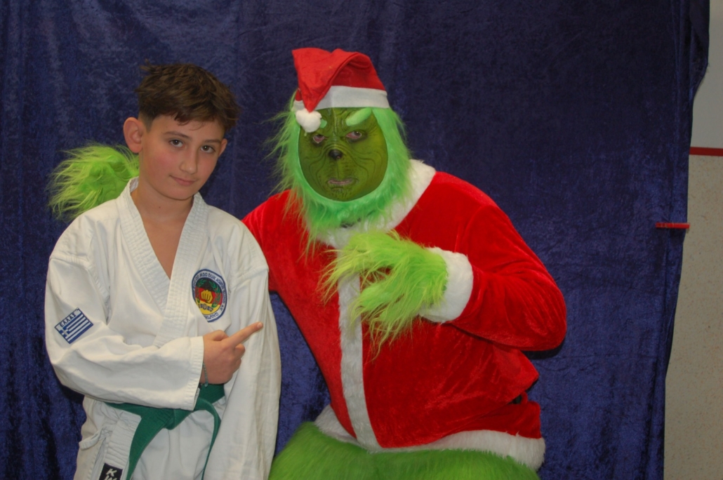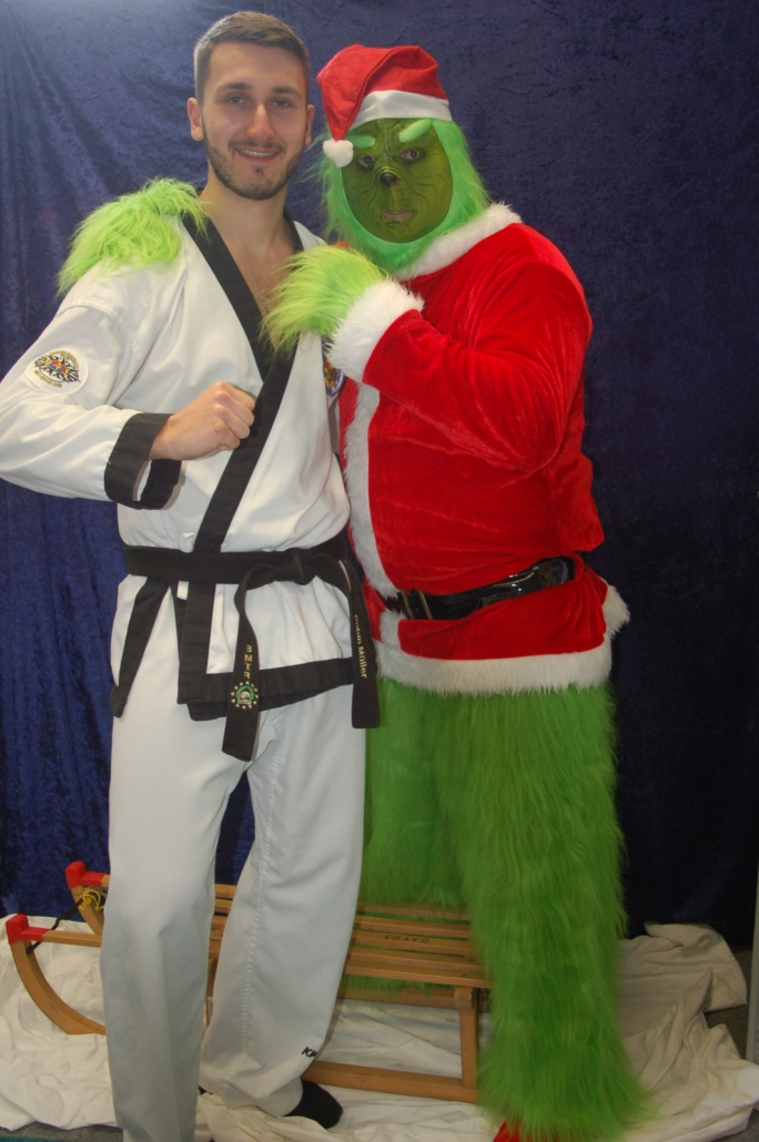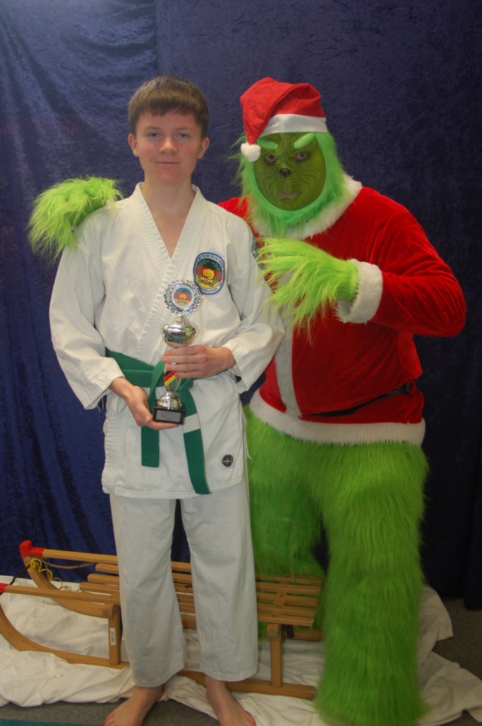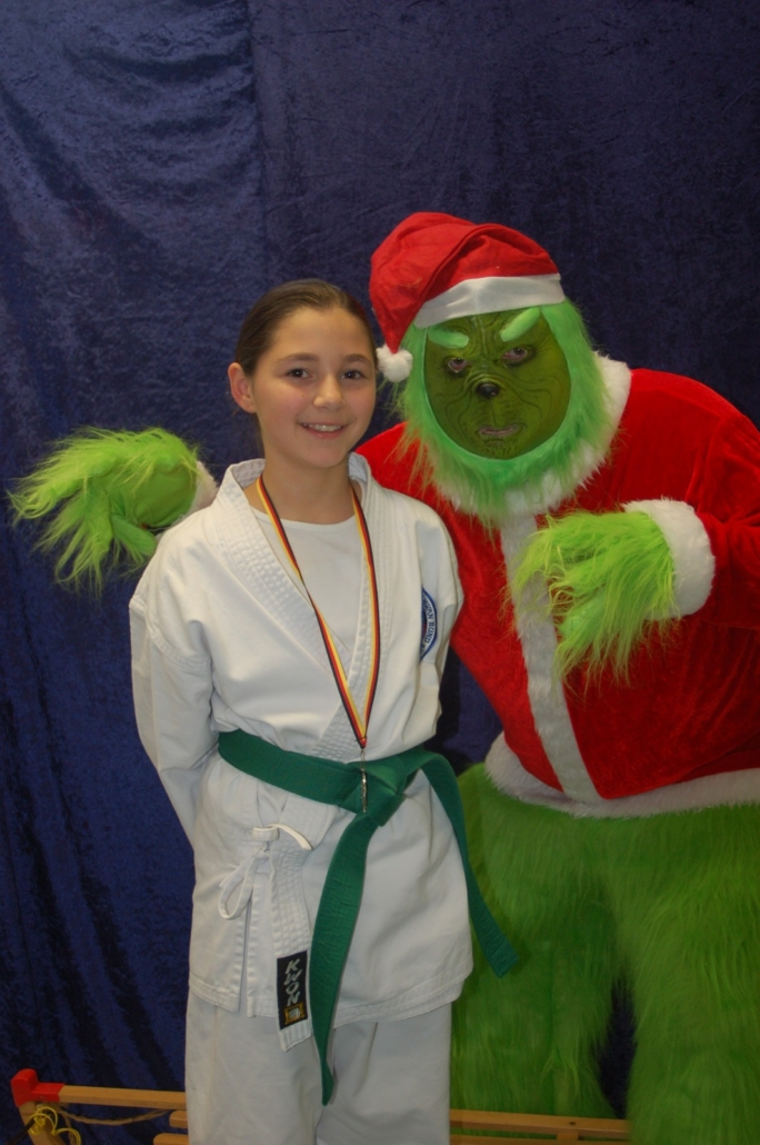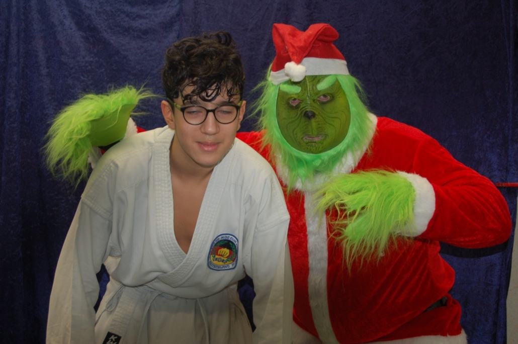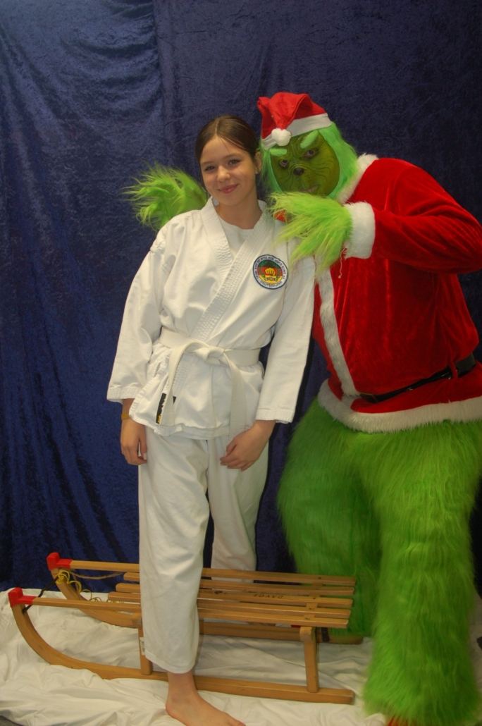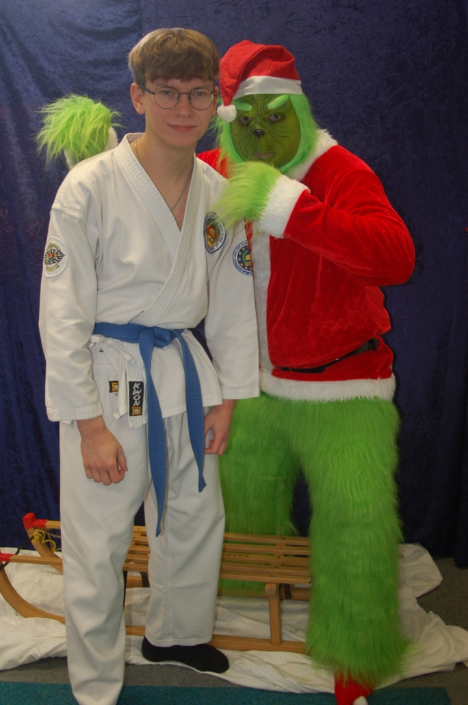 Wer hätte gedacht, dass ausgerechnet der Grinch den Weg ins Kodang Gym Letmathe findet? Zwischen den Wettkämpfen schlich er sich plötzlich in die Halle – und sorgte für jede Menge Gelächter. Statt Geschenke zu klauen, versuchte er diesmal, den Technikerpokal an sich zu reißen. Zum Glück war Nevio Palermo schneller und verteidigte seine Trophäe mit sportlichem Einsatz.